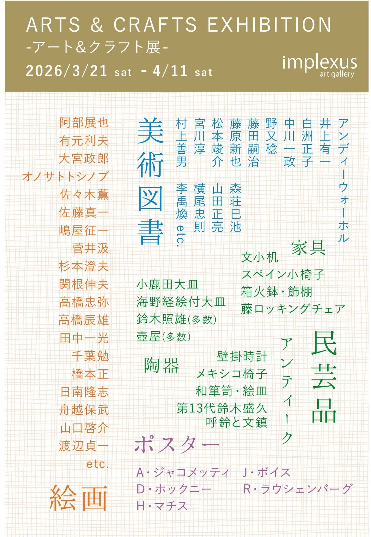 「ARTS & CRAFTS EXHIBITION」-アート&クラフト展-を開催いたします。